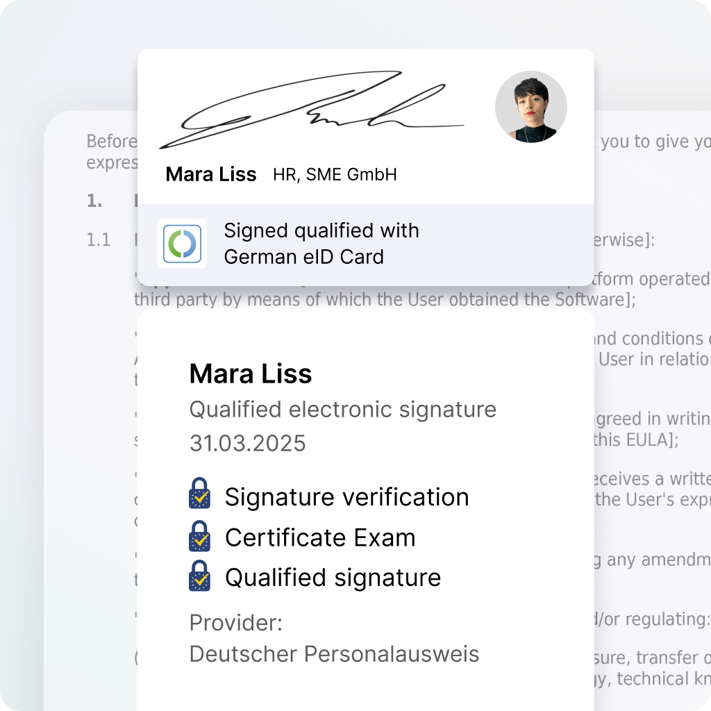 sproof GmbH е създадена, за да разработи цялостно решение за електронен подпис, което е безкомпромисно сигурно, надеждно и може да се използва в международен план. 100% съвместимо с eIDAS и ZertES, сертифицирано по ISO 27001 и изцяло хоствано в ЕС - за компании, които трябва да отговарят на най-високите изисквания за съответствие.