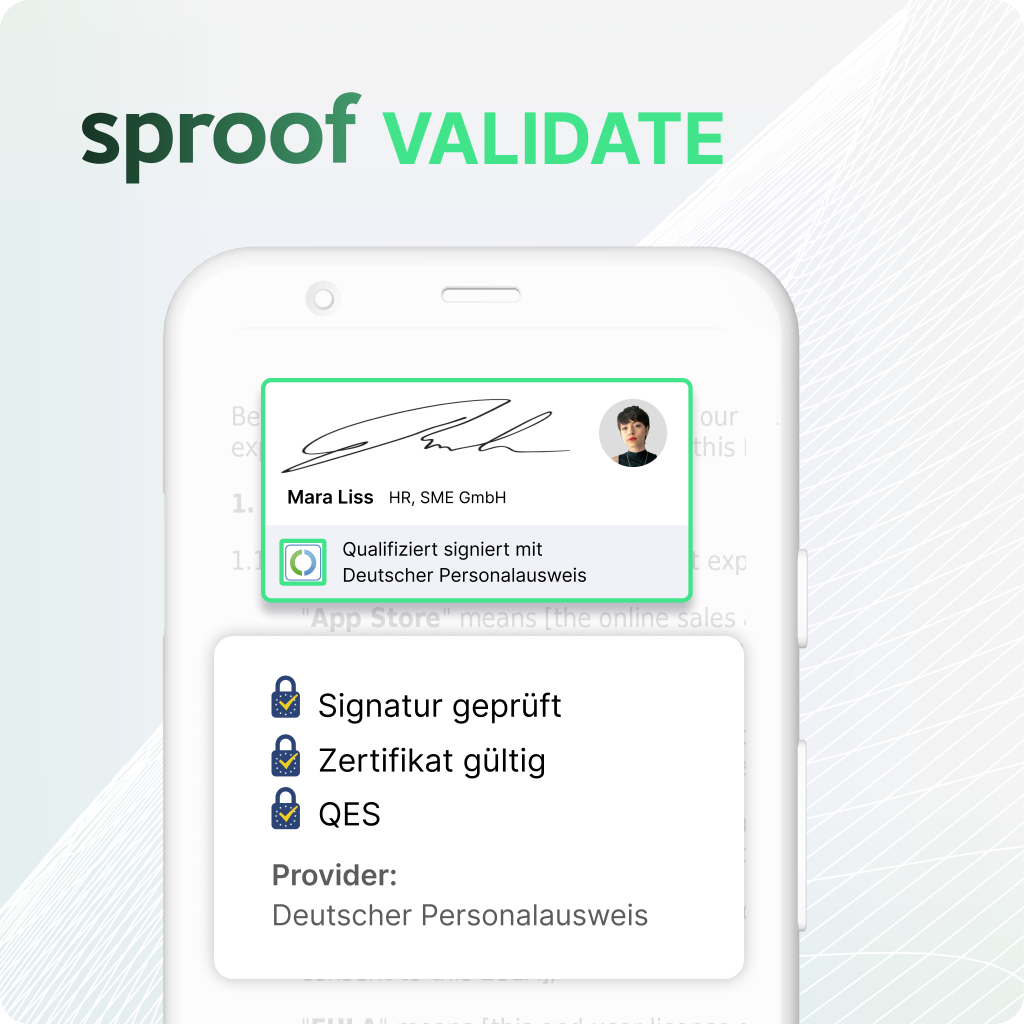 • С помощта на sproof Validate компаниите проверяват цифровите подписи на стандартни договори по законосъобразен начин и потвърждават автентичността им автоматично чрез софтуер или API.