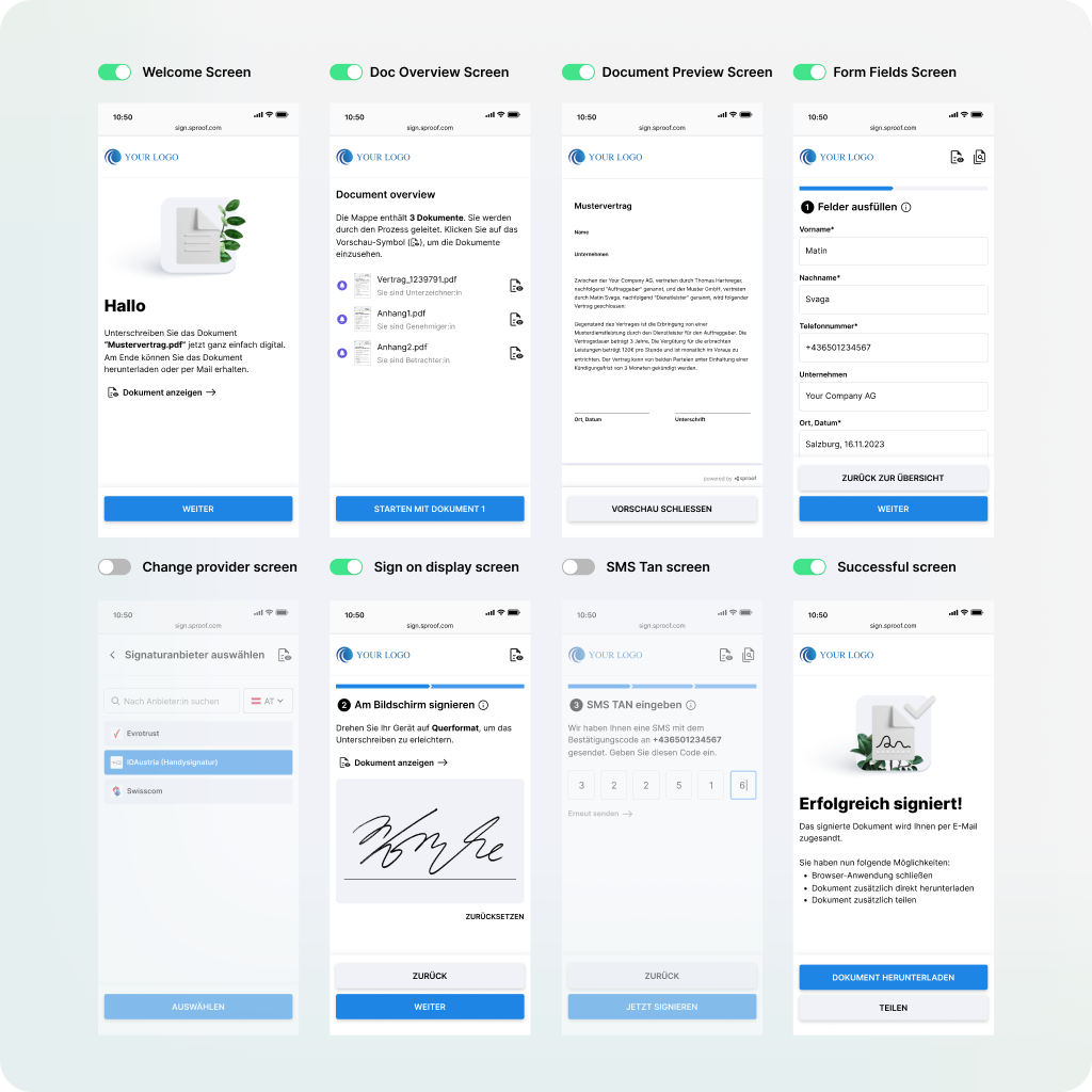 El Fastlane de sproof es un proceso digital simplificado al máximo para la recogida sin barreras de firmas electrónicas o datos de formularios legalmente válidos. El punto fuerte de sproof Fastlane es el diseño flexible de la interfaz de usuario de la ruta en línea y la posibilidad de integrarlo con flexibilidad en tus procesos y casos de uso.