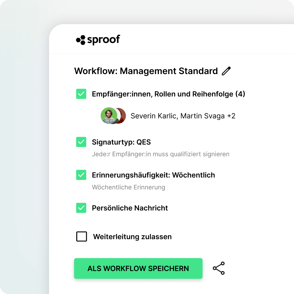 Cu sproof sign, chiar și fluxurile complexe de semnături și regulile de desenare pot fi mapate digital. Prin distribuirea flexibilă a rolurilor, secvențe definibile individual în fluxul de lucru și definirea standardelor specifice de semnătură (QES, FES, EES), vă asigurați că fiecare semnătură digitală îndeplinește cerințele interne și legale.
